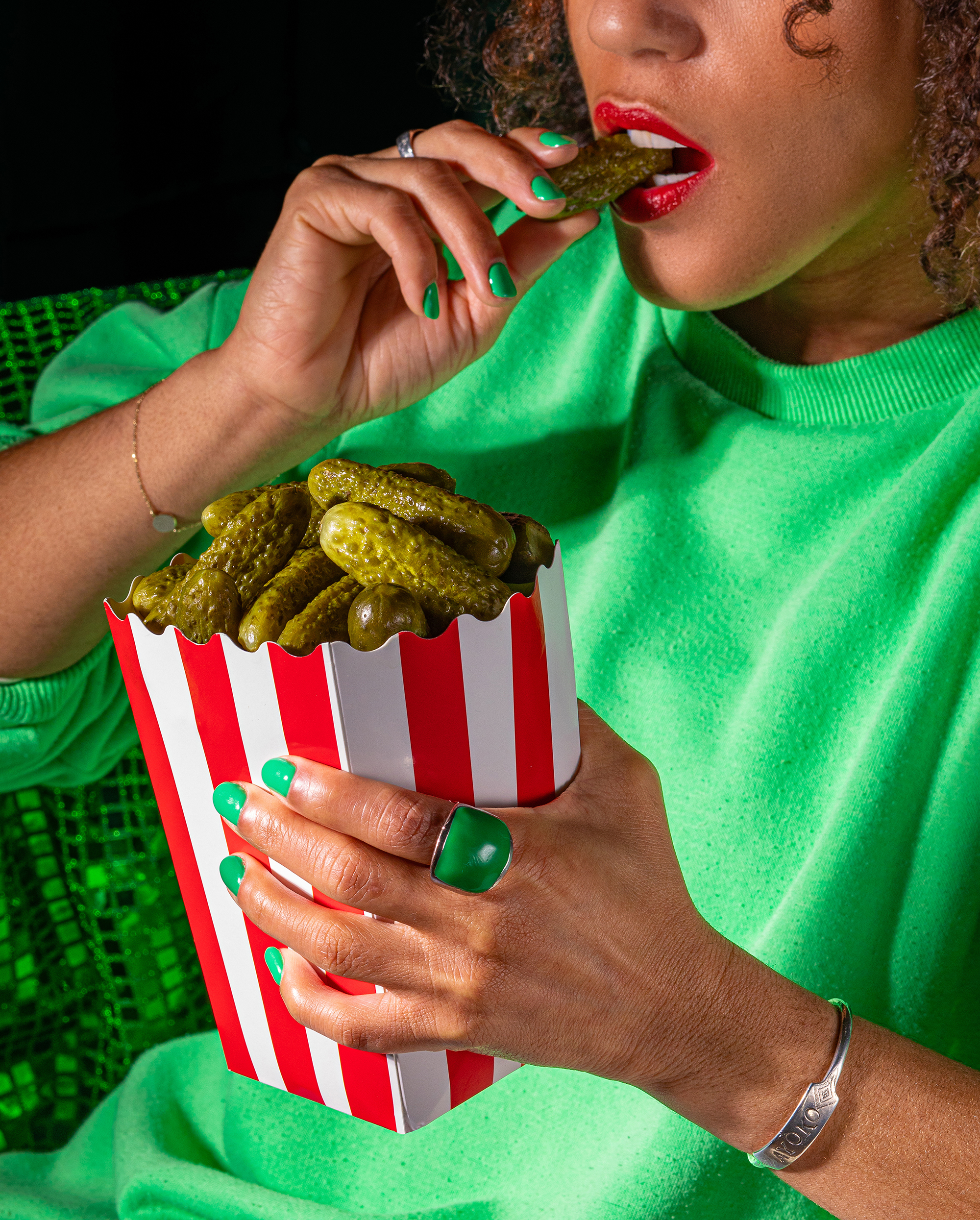 La direction artistique s’inscrit dans l’univers visuel de Bravo Hugo : une palette verte forte, des références à la pop culture et une esthétique festive. Le jeu d’échelle, notamment avec DJ Pickle, apporte une dimension miniature et précieuse, tandis que Pop Cornichon détourne des codes universels pour créer des images immédiatement lisibles et mémorables.