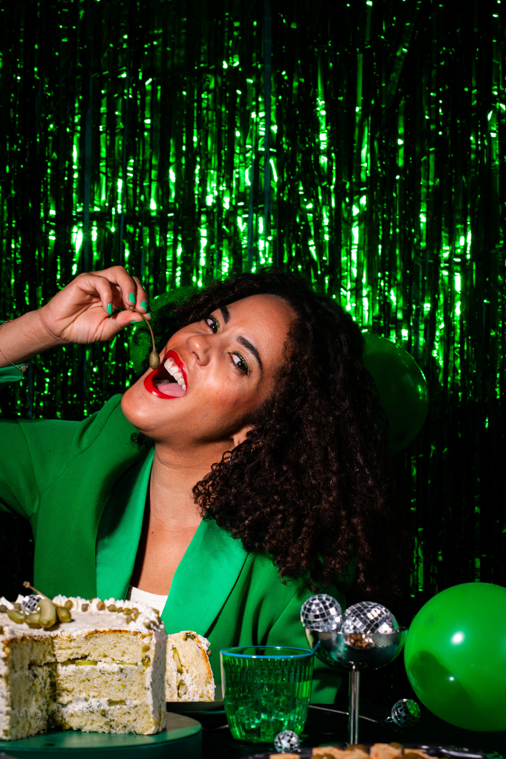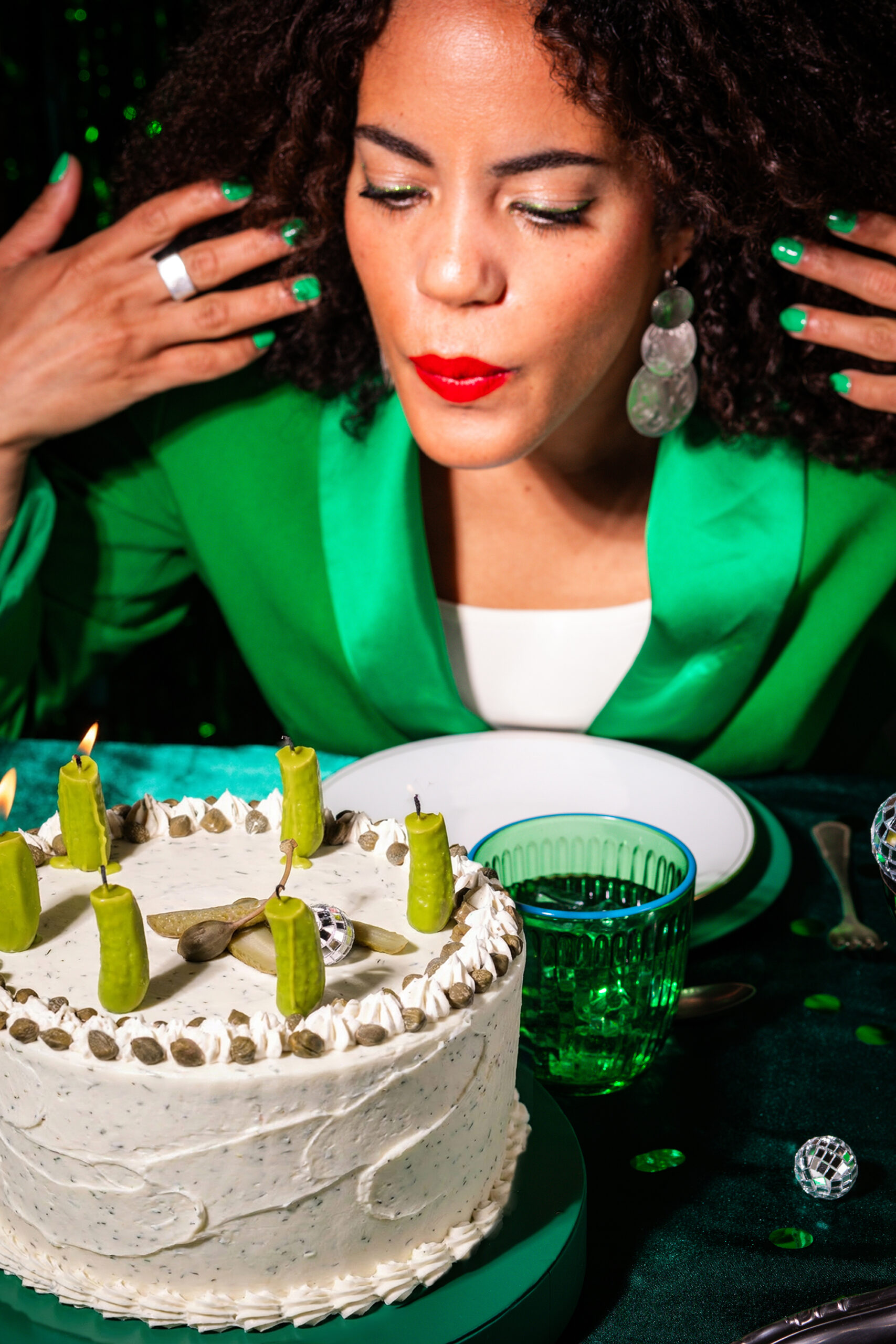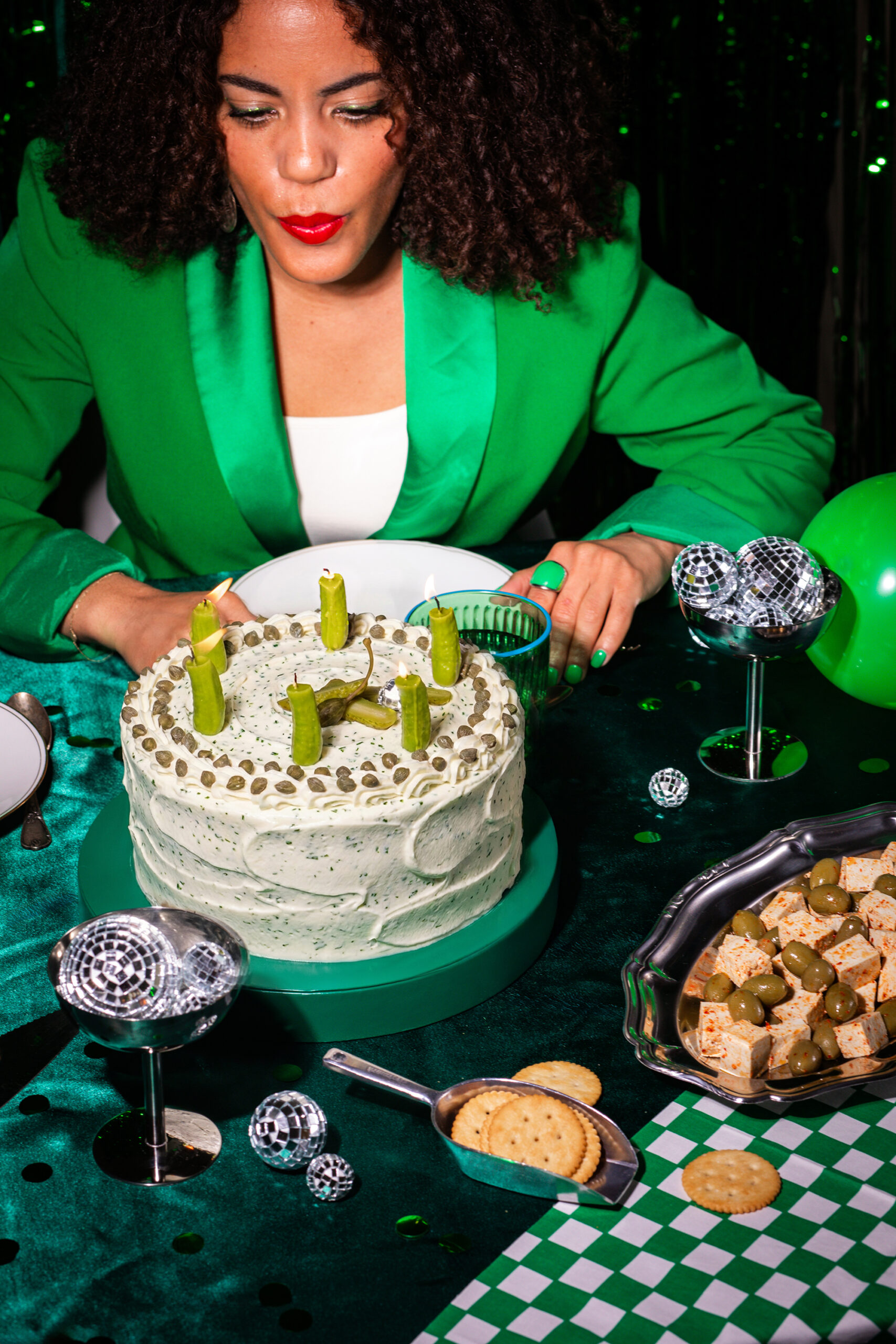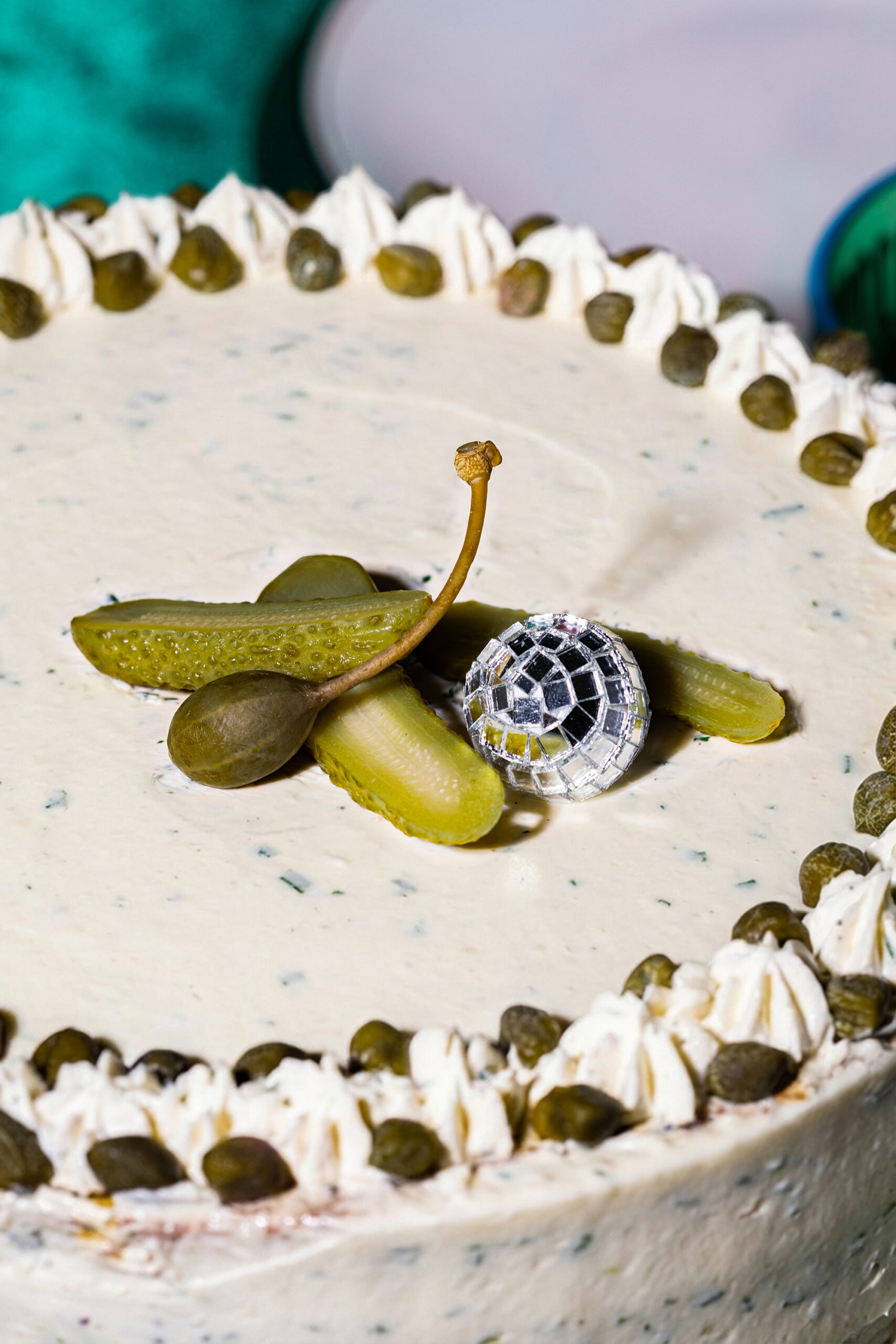 Pour accompagner cet objet visuel, nous avons imaginé une direction artistique inspirée de l’univers de l’anniversaire, revisité à travers un prisme retro et contemporain. Le gâteau est mis en scène comme une pièce centrale, entouré d’éléments festifs détournés : boules à facettes miniatures, confettis, bougies en cornichon, et accessoires chromés qui évoquent autant la fête que la culture visuelle actuelle.