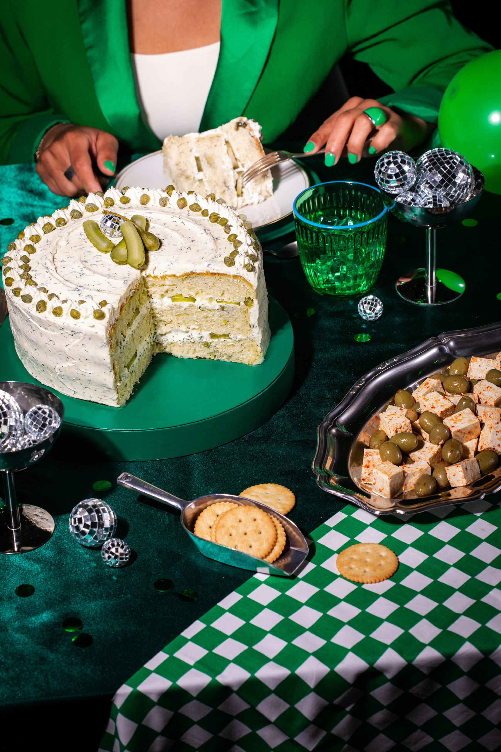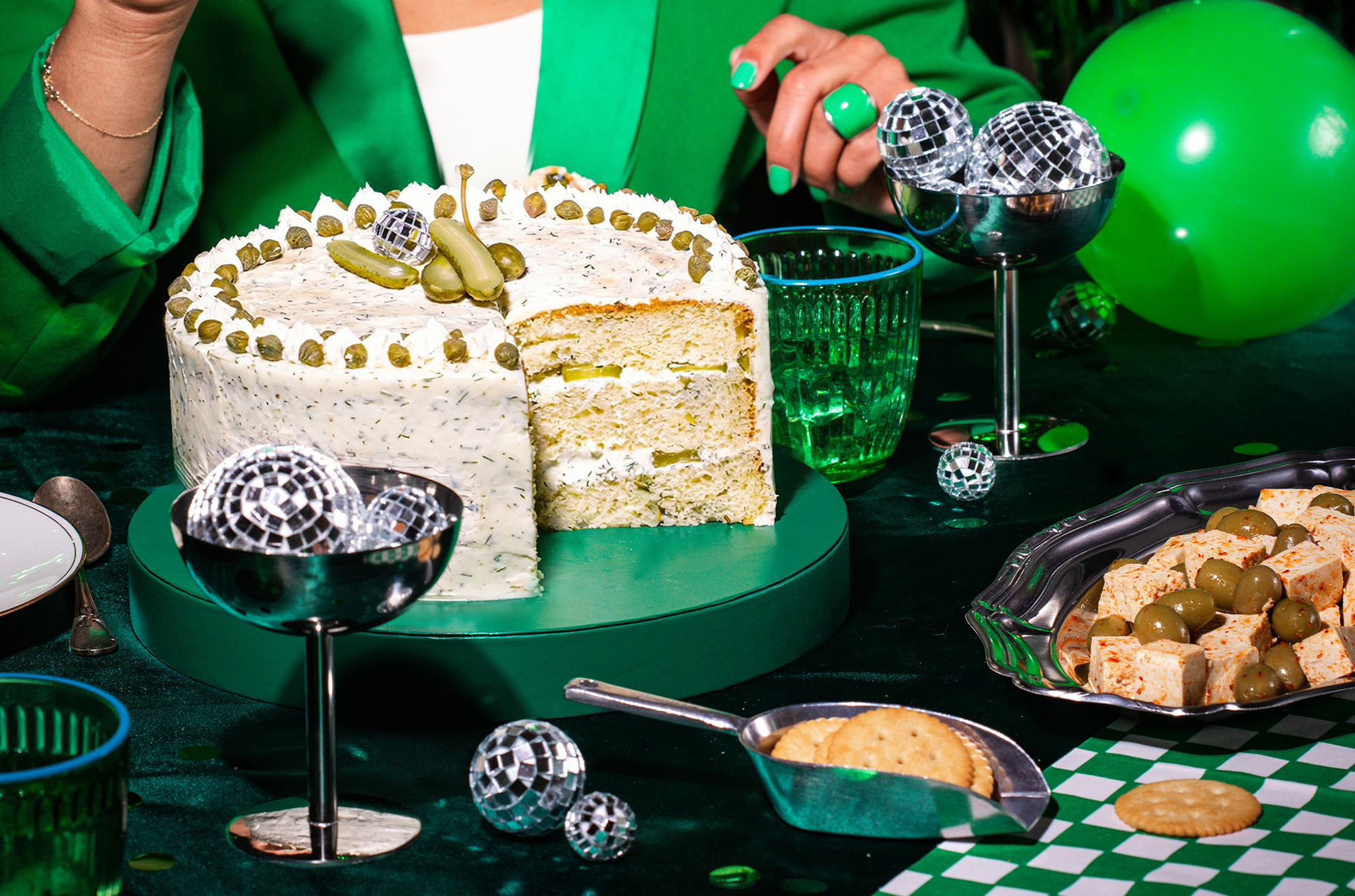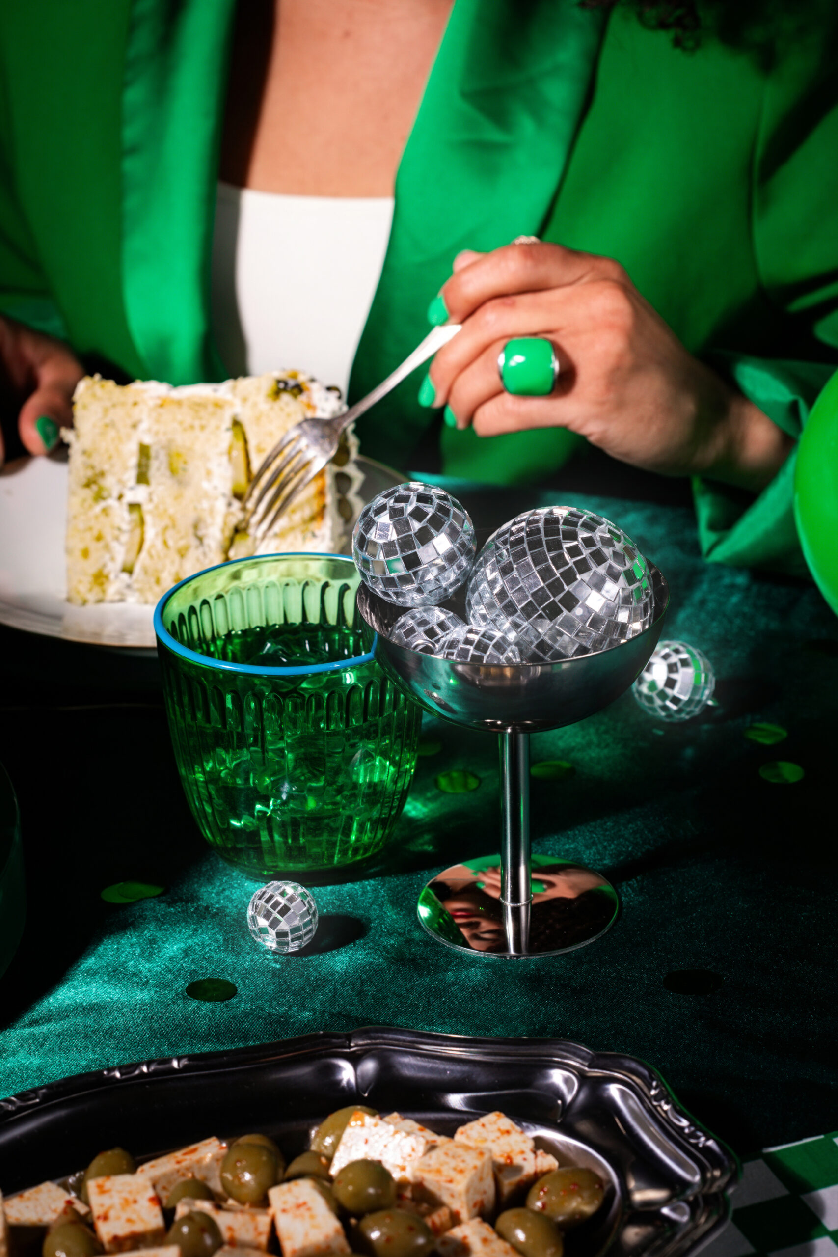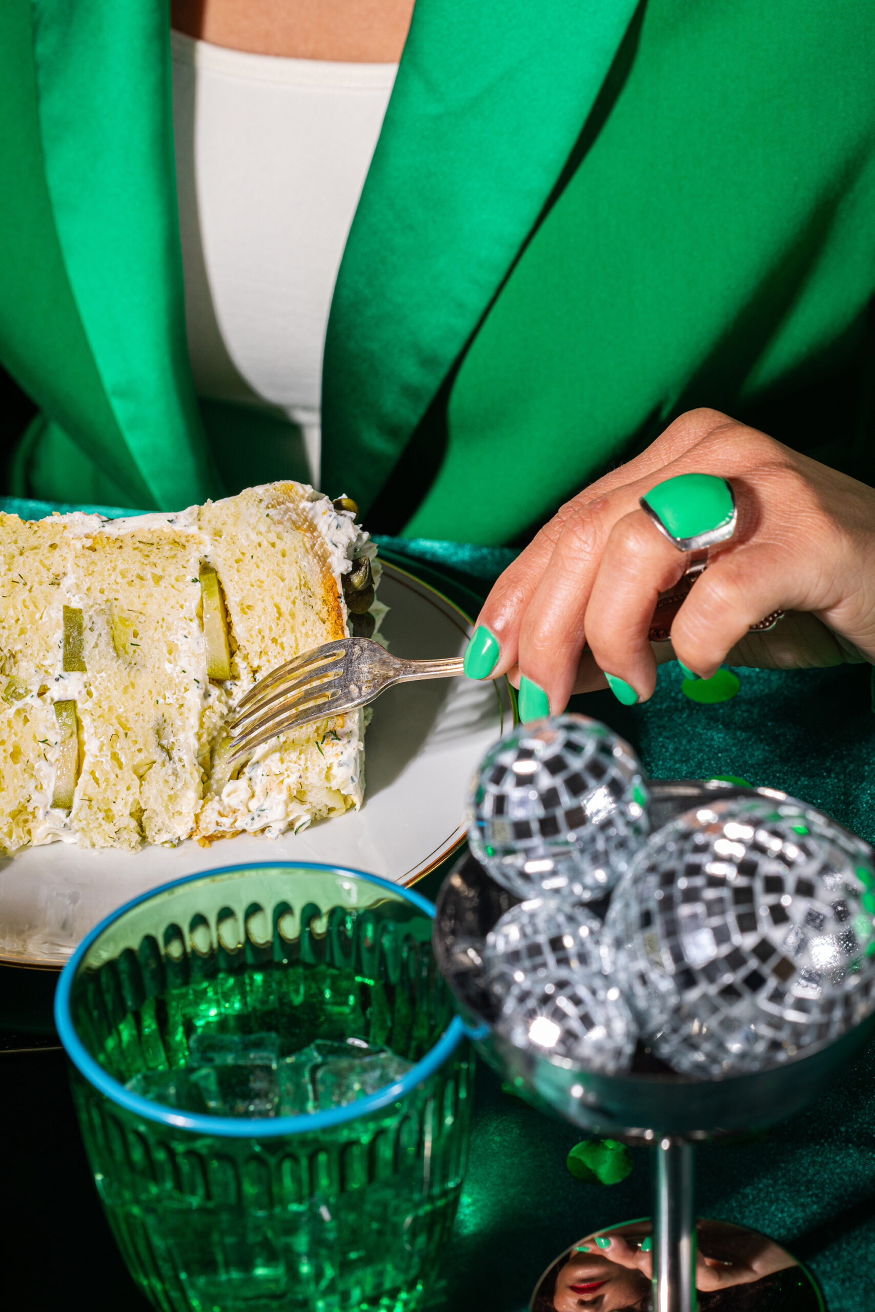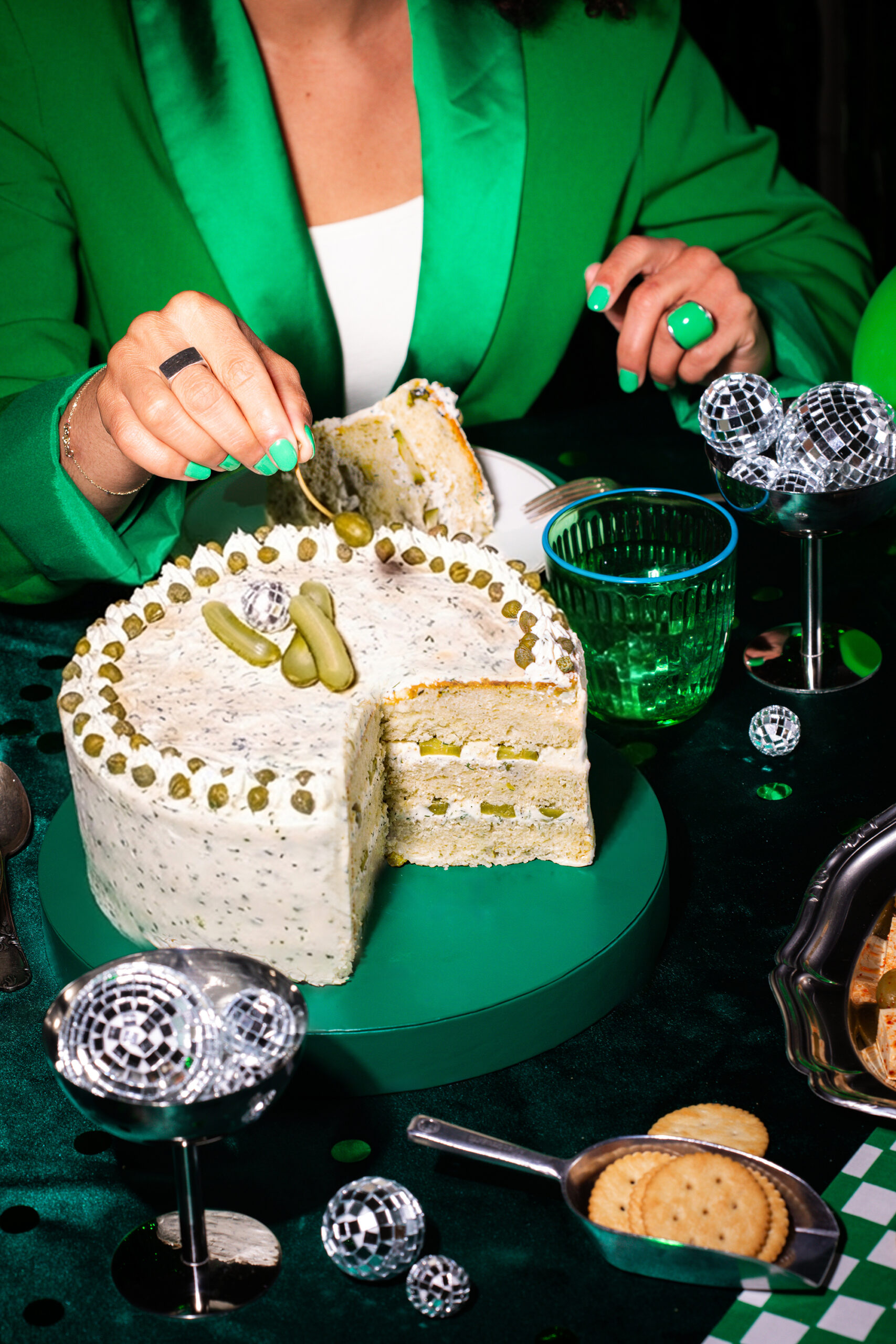 Pour accompagner cet objet visuel, nous avons imaginé une direction artistique inspirée de l’univers de l’anniversaire, revisité à travers un prisme retro et contemporain. Le gâteau est mis en scène comme une pièce centrale, entouré d’éléments festifs détournés : boules à facettes miniatures, confettis, bougies en cornichon, et accessoires chromés qui évoquent autant la fête que la culture visuelle actuelle.